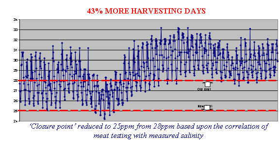 By correlating meat testing with salinity the ‘ppm’ reading for closure can be refined to ensure closures never occur needlessly. The following graph shows how one harvest area was able to achieve 43% more harvesting time with the use of DAN salinity data.